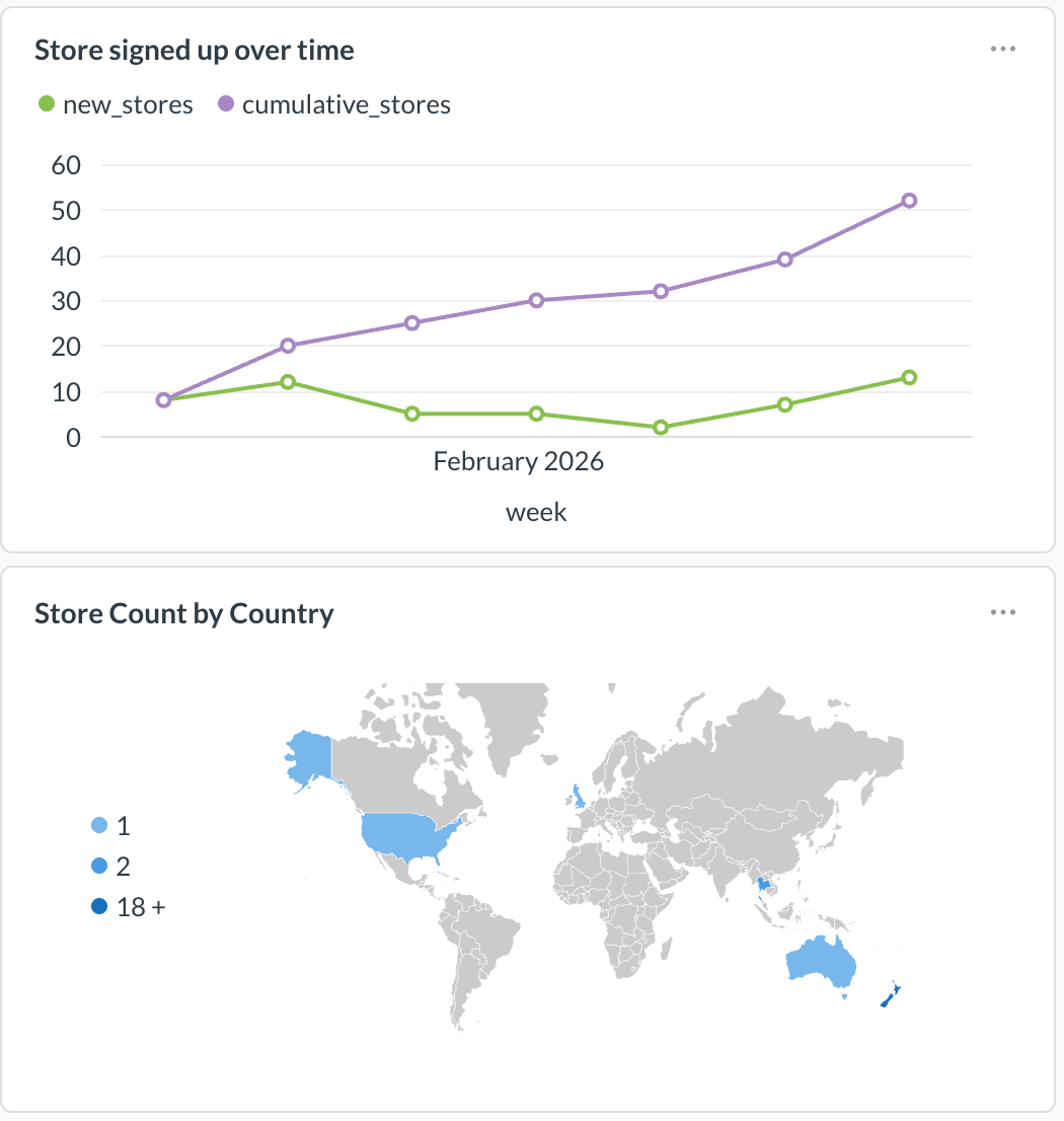 Internal Data Dashboard: Built & Live. We shipped an internal analytics tool giving us real-time visibility across the platform: store signups, store handles, transaction volume, and other key performance metrics. We can now see exactly how the platform is performing and move faster on decisions because of it.